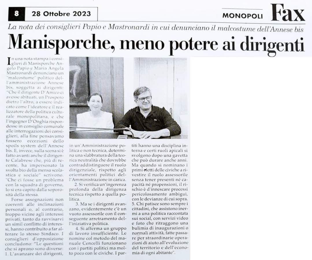Che il dirigente D’Amico ci avesse abituati, un prospero dietro l’altro, a essere indicato come l’ideatore e il realizzatore della politica culturale monopolitana, e che l’ingegner D’Onghia rispondesse in consiglio comunale alle interrogazioni dei consiglieri, alla fine pensavamo fossero eccezioni dello spoils system dell’Annese bis. E, invece, sulla scena si è fatto avanti anche il dirigente Calabrese che, più di recente, ha impersonato la svolta bio della mensa scolastica e sociale.