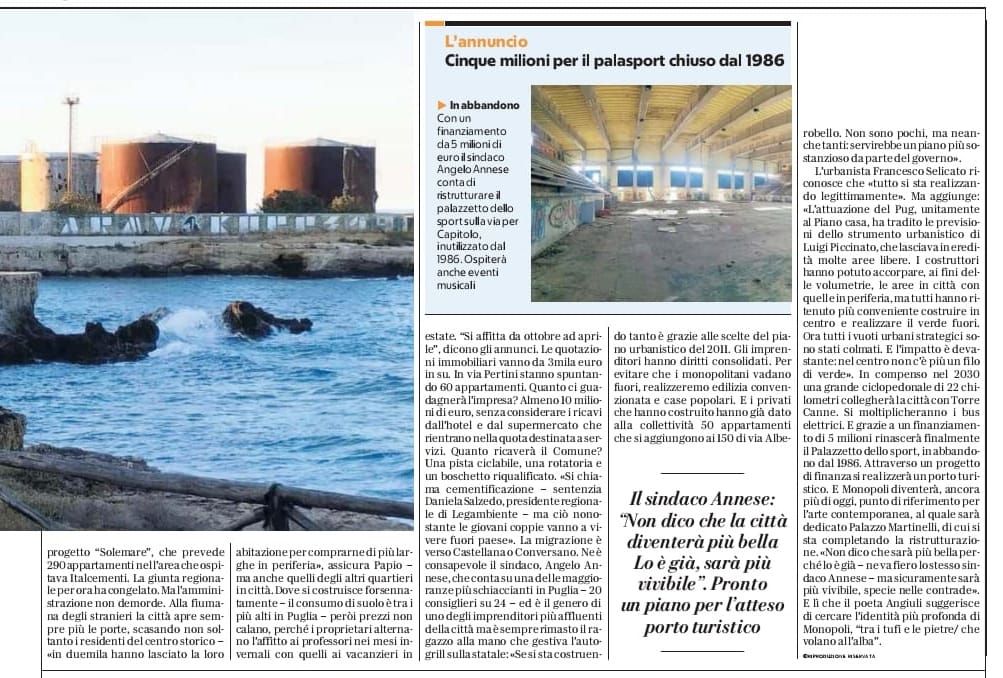 Fuori dal coro il sindaco Angelo Annese, che a proposito della Monopoli del futuro con fierezza afferma “๐๐ฐ๐ฏ ๐ฅ๐ช๐ค๐ฐ ๐ค๐ฉ๐ฆ ๐ด๐ข๐ณ๐ขฬ ๐ฑ๐ช๐ถฬ ๐ฃ๐ฆ๐ญ๐ญ๐ข ๐ฑ๐ฆ๐ณ๐ค๐ฉ๐ฆฬ ๐ญ๐ฐ ๐ฆฬ ๐จ๐ช๐ขฬ, ๐ฎ๐ข ๐ด๐ช๐ค๐ถ๐ณ๐ข๐ฎ๐ฆ๐ฏ๐ต๐ฆ ๐ด๐ข๐ณ๐ขฬ ๐ฑ๐ช๐ถฬ ๐ท๐ช๐ท๐ช๐ฃ๐ช๐ญ๐ฆ, ๐ด๐ฑ๐ฆ๐ค๐ช๐ฆ ๐ฏ๐ฆ๐ญ๐ญ๐ฆ ๐ค๐ฐ๐ฏ๐ต๐ณ๐ข๐ฅ๐ฆ”